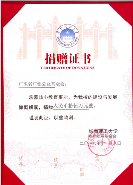 11月8日,廣鋁公益基金會繼續(xù)向華南理工大學捐贈人民幣15萬元,用于資助材料科學與工程學院、機械與汽車工程學院、經(jīng)濟與貿(mào)易學院和設計學院等學院品學兼優(yōu)的家庭經(jīng)濟困難學生,共資助30人,每人5000元。基金會對所資助的大學生寄予了厚望,希望每個被資助的學生自強不息、努力學習、早日成才,希望同學們要常懷感恩之心,傳遞愛心、回報社會,用身體力行回饋社會、幫助他人,在奉獻社會中實現(xiàn)人生更大的價值。