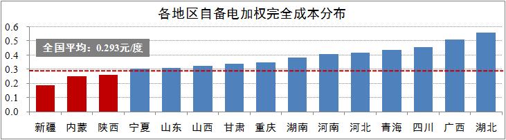 目前,全國共有40家電解鋁企業(yè)配有自用電廠,占全國電解鋁企業(yè)總數(shù)比重為39%,自備電產(chǎn)能占全國總產(chǎn)能的57%。作為電解鋁主要成本構成要素之一,現(xiàn)階段電力成本占據(jù)電解鋁成本的35%。綜合分析全國各地區(qū)自備電加權完全成本,截至今年3月份,僅有新疆、內(nèi)蒙、陜西的加權完全成本低于0.293元/度的全國平均水平,其中新疆地區(qū)自備電成本為0.187元/度。從電解鋁廠完全成本上看,尚未投入使用自備電的電解鋁廠基本處于虧損運營行列,預計虧損面將隨著越來越多自備電的投入使用而逐步有所緩解。