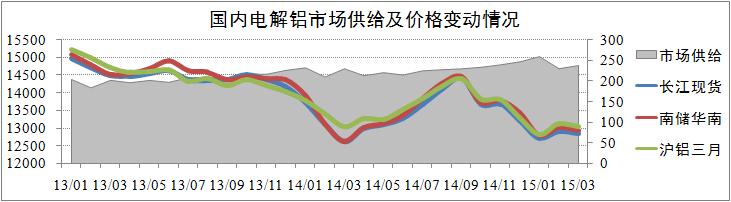 自2014年9月份全國鋁價出現(xiàn)高位回落以來,今年前三月份鋁價基本在12800元/噸-13100元/噸的區(qū)間內(nèi)波動。市場供給方面,2015年1-2月全國產(chǎn)量分別為262萬噸和232萬噸,同比增長率約為8%,市場供給并未出現(xiàn)實質(zhì)性的縮減。目前,全國電解鋁市場價格已整體逼近2013年以來的最低水平,預計上半年將進一步跌破至12500元/噸關口,下半年鋁價將出現(xiàn)整體回升。