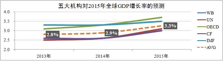 發(fā)稿時(shí)間:2015-04-11根據(jù)世界銀行(World Bank)、聯(lián)合國(guó)(United Nations)、經(jīng)濟(jì)合作與發(fā)展組織(OECD)、英國(guó)共識(shí)公司(Consensus Forecasts)及國(guó)際貨幣基金組織(IMF)等五大國(guó)際權(quán)威機(jī)構(gòu)的預(yù)測(cè),2015年全球經(jīng)濟(jì)形勢(shì)整體好于2014年,下半年全球經(jīng)濟(jì)增速將會(huì)有較為顯著的回升,其中主要得益于全球貿(mào)易的逐步增長(zhǎng)、通貨膨脹及失業(yè)率的繼續(xù)走低,預(yù)計(jì)全年全球GDP加權(quán)平均增速為3.3%,較2014年提升0.4個(gè)百分點(diǎn)。
