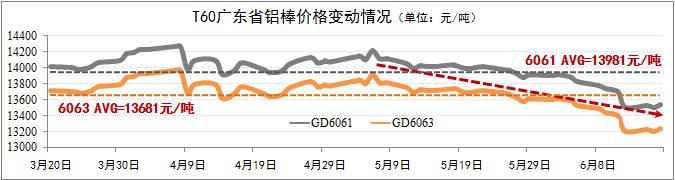 發(fā)稿時間:2015-06-17鋁棒現(xiàn)貨價格明顯下浮。截至6月17日,廣東6061棒價格下浮至13545元/噸,6063棒價格下浮至13245元/噸,兩者均低于60天(T60)均價超過400元/噸。鋁棒價格迅速下浮主要受原鋁市場價格下浮的影響。隨著鋁材生產(chǎn)旺季的到來以及鋁材出口的增長,預(yù)計鋁棒下浮趨勢于7月初出現(xiàn)溫和反彈,省內(nèi)6061棒及6063棒的價格回歸至T60均價水平的可能性較大。