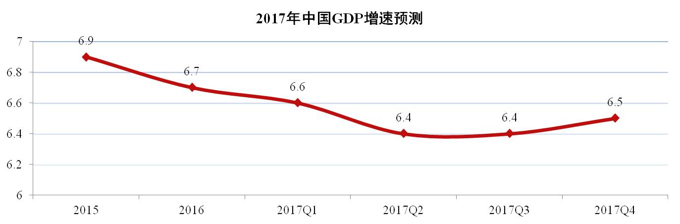 2017 年政府工作報告中稱,基于國外復(fù)雜的經(jīng)濟形勢以及國內(nèi)推進(jìn)供給側(cè)改革的需要,2017年中國經(jīng)濟將繼續(xù)維持平穩(wěn)增長,全年GDP增長目標(biāo)預(yù)期為6.5%,較2016年下降0.2個百分點。預(yù)計經(jīng)濟增長將呈現(xiàn)“前高后低”格局,經(jīng)濟減緩的幅度將逐步減小,并不斷向潛在經(jīng)濟增速收斂。考慮去年4季度經(jīng)濟企穩(wěn)回升(4季度6.8%,前三季度6.7%),今年以來經(jīng)濟活動繼續(xù)保持較強增長勢頭。預(yù)計2017年國內(nèi)經(jīng)濟形勢將逐漸明朗,轉(zhuǎn)折點或出現(xiàn)在第三季度。