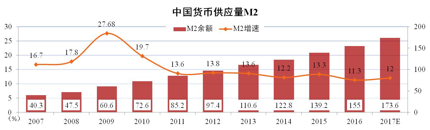 兩會期間李克強總理在政府工作報告中指出, 2017年貨幣政策要保持穩(wěn)健中性。因此,廣義貨幣M2預(yù)期增長均為12%左右。在2016年政府工作報告提出廣義貨幣M2預(yù)期增長在13%左右;但央行發(fā)布的2016年金融統(tǒng)計數(shù)據(jù)報告顯示,2016年廣義貨幣供應(yīng)量(M2)余額155.0萬億元,僅比上年增長11.3%。