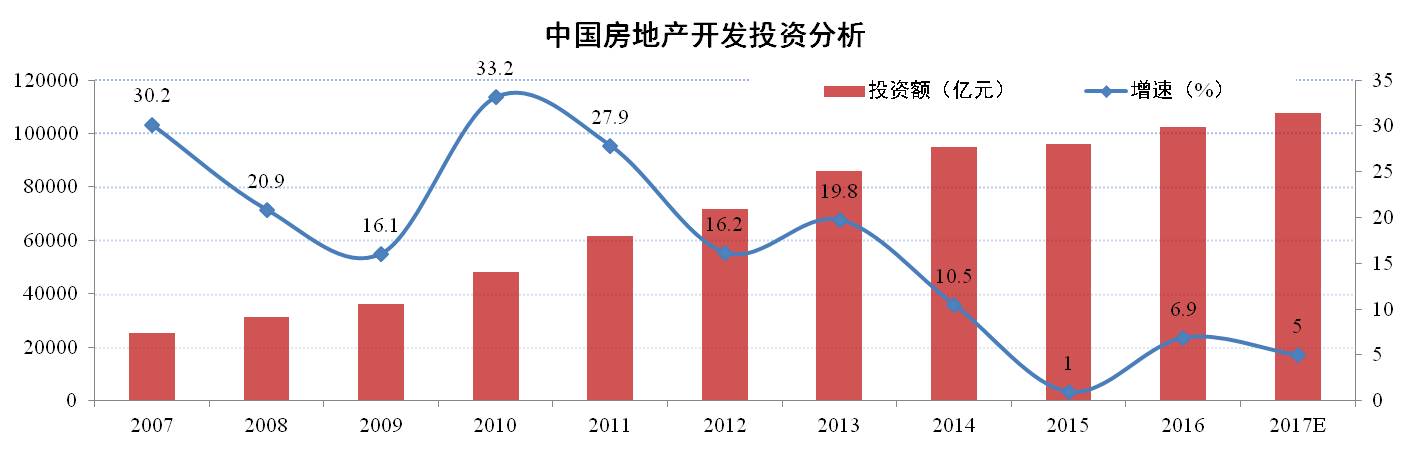 2017年政府工作報告再次明確房地產(chǎn)居住屬性定位,指出堅持住房的居住屬性,落實地方政府主體責任,加快建立和完善促進房地產(chǎn)市場平穩(wěn)健康發(fā)展的長效機制,以市場為主滿足多層次需求,以政府為主提供基本保障。預計2017年隨著調(diào)控政策不斷疊加、調(diào)控效果不斷釋放,市場降溫幅度將逐步擴大,但由于當前調(diào)控以穩(wěn)為主,房地產(chǎn)市場總體將呈現(xiàn)平穩(wěn)的趨勢。因此,2017年房地產(chǎn)開發(fā)投資增速或維持在5%以內(nèi),去庫存和降杠桿仍將是2017年兩大主要任務。
