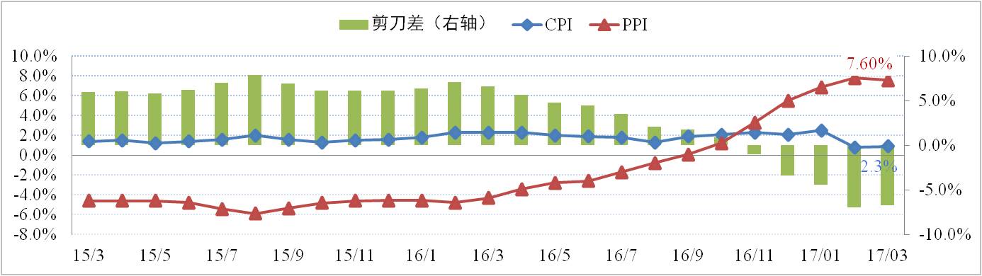 一季度國內(nèi)經(jīng)濟呈現(xiàn)投資回升、貿(mào)易趨勢性向好,PMI、CPI、PPI等主要經(jīng)濟指標(biāo)數(shù)據(jù)均呈現(xiàn)向好局面,因此預(yù)計一季度GDP增長6.8%。但國內(nèi)經(jīng)濟仍然呈現(xiàn)出工業(yè)生產(chǎn)穩(wěn)以及消費數(shù)據(jù)弱的格局,主要表現(xiàn)在價格層面上PPI與CPI的剪刀差仍高,3月份CPI同比上漲0.9%連續(xù)兩個月同比增長低于1%;PPI同比上漲7.6%,環(huán)比回落0.2個百分點漲幅依然處于高位。國內(nèi)經(jīng)濟增長面臨的風(fēng)險主要來自金融和房地產(chǎn)風(fēng)險兩個方面;其中,主要包括債務(wù)違約和債務(wù)處置負(fù)擔(dān)沉重、房地產(chǎn)投資和民間投資增速下滑、去杠桿、去產(chǎn)能和隱性失業(yè)問題等風(fēng)險。