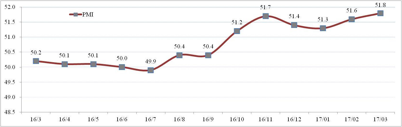 國家統(tǒng)計局?jǐn)?shù)據(jù)顯示,2017年3月份制造業(yè)采購經(jīng)理指數(shù)PMI為51.8%,連續(xù)兩月上升。其中,生產(chǎn)指數(shù)和新訂單指數(shù)為54.2%和53.3%,分別比上月上升0.5和0.3個百分點。在生產(chǎn)和需求增速回暖的同時企業(yè)采購力度加大,采購量指數(shù)為53.4%,高于上月2.0個百分點。