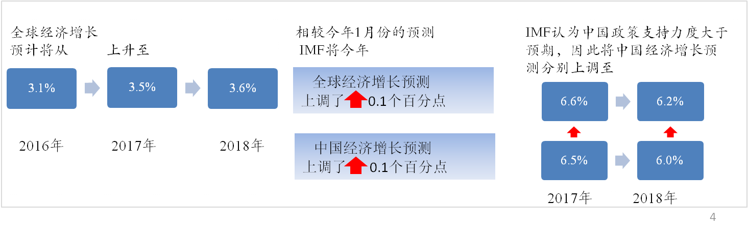 根據(jù)國際貨幣基金組織(IMF)《世界經(jīng)濟(jì)展望》數(shù)據(jù)顯示,在金融市場以及制造業(yè)和貿(mào)易周期性復(fù)蘇支持下,全球經(jīng)濟(jì)增長預(yù)計將從2016年的3.1%上升至2017年的3.5%和2018年的3.6%。相較1月份IMF將今年全球和中國經(jīng)濟(jì)增長預(yù)測均上調(diào)了0.1個百分點(diǎn)。