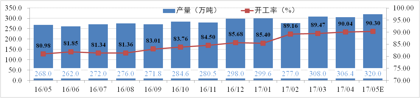 分析認(rèn)為:供給側(cè)改革政策已經(jīng)落地,短期內(nèi)仍難以改變供需格局,因此市場供應(yīng)仍將保持在高位。預(yù)期5月產(chǎn)量320萬噸,日化產(chǎn)量10.32萬噸,供應(yīng)持續(xù)增加。