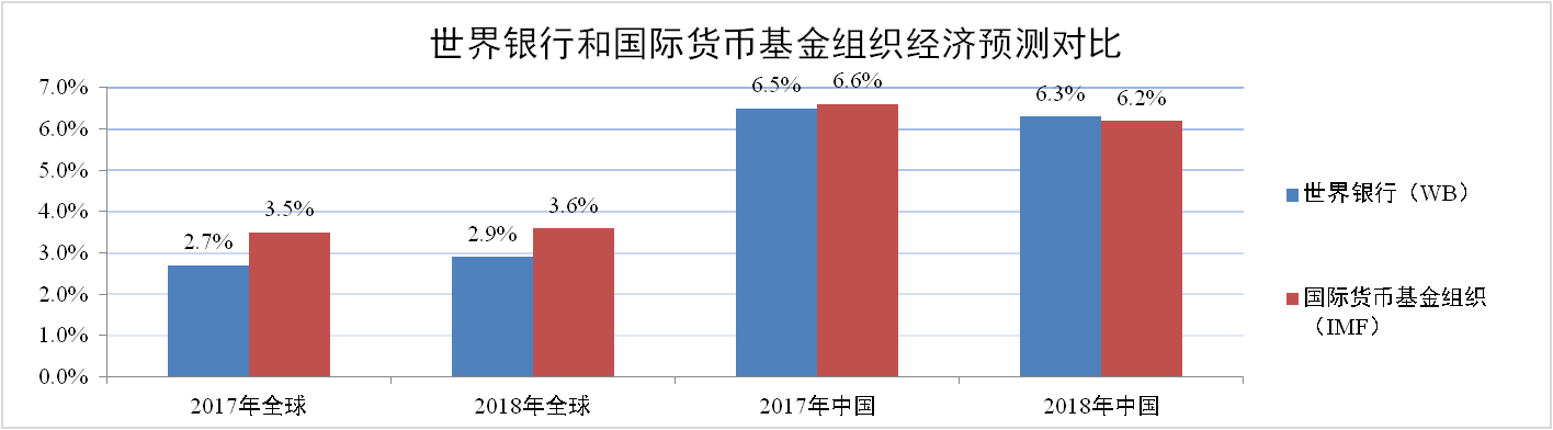 世界銀行2017年6月《全球經(jīng)濟(jì)展望》數(shù)據(jù)顯示,隨著制造業(yè)和貿(mào)易回暖以及大宗商品價格趨穩(wěn),預(yù)計2017年和2018年全球經(jīng)濟(jì)增速分別為2.7%和2.9%;發(fā)達(dá)經(jīng)濟(jì)體經(jīng)濟(jì)增速分別為1.9%和1.8%;新興市場和發(fā)展中經(jīng)濟(jì)體經(jīng)濟(jì)增速分別為4.1%和4.5%;中國經(jīng)濟(jì)增速分別為6.5%和6.3%。