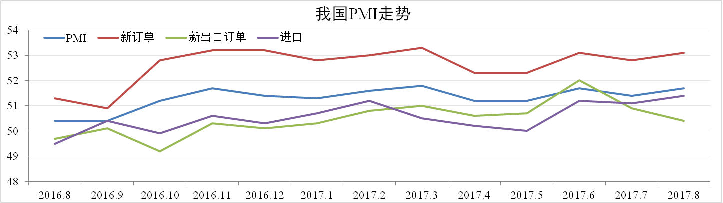 8月份我國(guó)制造業(yè)PMI為51.7,較上月上漲0.3,處于擴(kuò)張區(qū)間。分項(xiàng)中,生產(chǎn)自53.5上升至54.1,新出口訂單自50.9下降至50.4,進(jìn)口訂單自51.1上升至51.4,主要原材料購(gòu)進(jìn)價(jià)格自57.9大漲7.4個(gè)百分點(diǎn)至65.3。