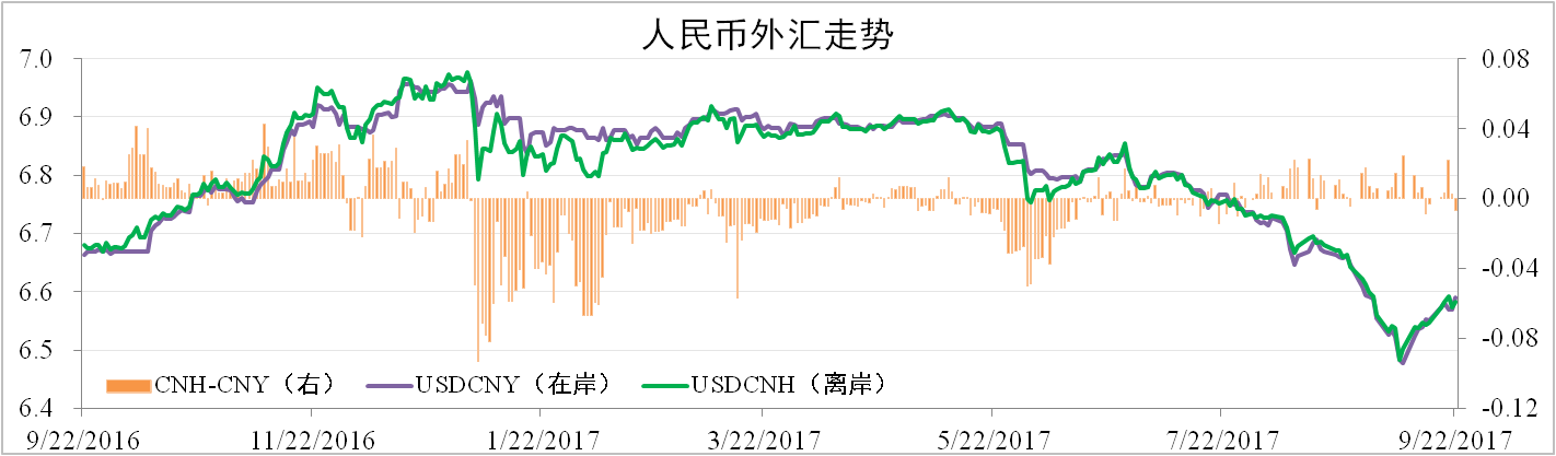 8月至9月中旬人民幣匯率呈“V”形走勢(shì)。截至9月22日,離岸人民幣匯率為6.5828,較9月7日的近一年最高點(diǎn)貶值1.53%,較8月22日升值1.16%。據(jù)央行通知,9月11日起,人民幣外匯風(fēng)險(xiǎn)準(zhǔn)備金自原有20%調(diào)整至0%。