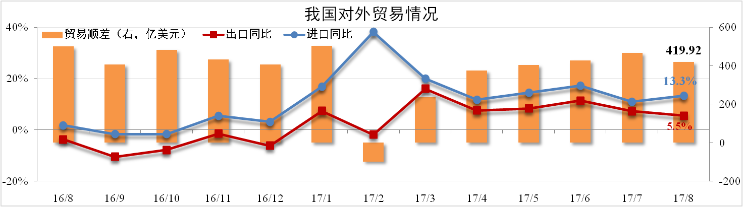 據(jù)海關(guān)總署數(shù)據(jù),8月份我國(guó)進(jìn)口量為1572.37億美元,同比上漲13.3%,較7月擴(kuò)大2.3個(gè)百分點(diǎn);出口量為1992.29億美元,同比上漲5.5%,較7月縮小1.7個(gè)百分點(diǎn)。貿(mào)易順差為419.92億美元,較上月下降10.15%。