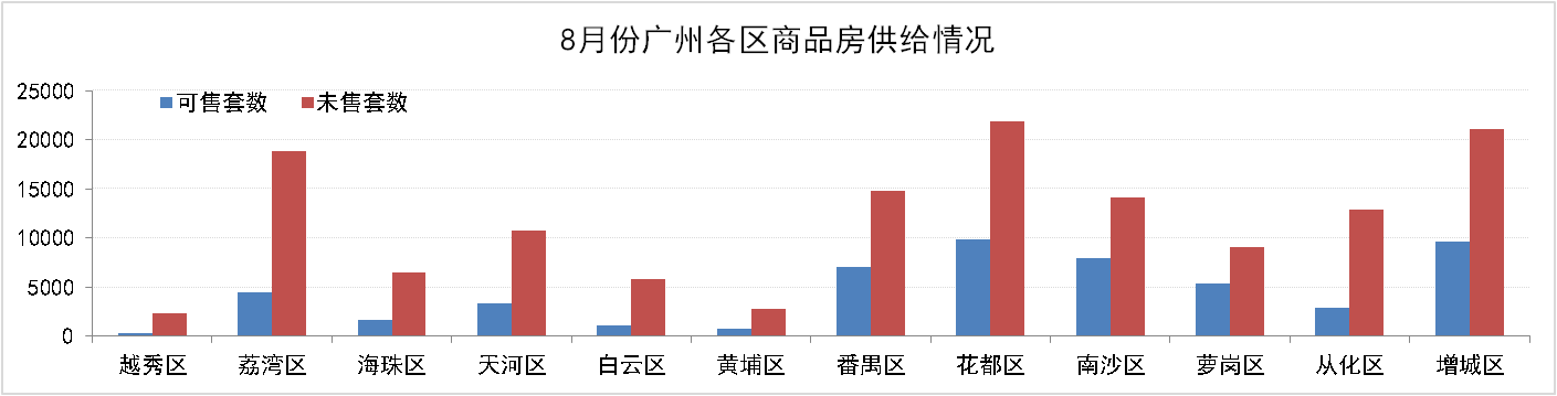 8月31日,廣州市新建住宅商品房共194,949套,環(huán)比上升3.1%,其中:可售住宅商品房為54,104套,占比27.75%;未售住宅商品房140,845套,占比72.25%。花都、增城、番禺、南沙庫存量較高,可售和未售房源累計(jì)占全市比例分別為63.73%和51.13% 。