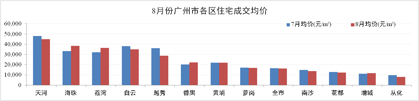 成交價(jià)方面:8月份廣州一手住宅成交均價(jià)16,313元/m2,環(huán)比下跌1.99%。其中,增城成交均價(jià)為11,617元/m2,環(huán)比上升3.03%。除海珠、荔灣、番禺及增城保持增長外,其他區(qū)域成交均價(jià)均錄得不同程度下跌,其中越秀跌幅達(dá)20.63%。