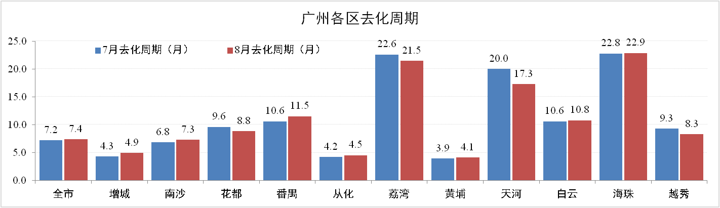 8月份廣州住宅地產(chǎn)去化率達(dá)86.6%,去化周期環(huán)比增加0.2個月為7.4個月。其中,增城、南海、番禺三區(qū)去化周期有所上升。但由于外圍地區(qū)剛需強(qiáng)勁,增城、從化、黃埔等保持低去化周期,增城去化周期僅為4.3個月。