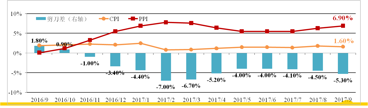 9月份我國(guó)CPI為1.6%,較上月縮小0.2個(gè)百分點(diǎn),略低于市場(chǎng)預(yù)期,蔬菜 價(jià)格增速大幅放緩是主要原因,而核心CPI從2.2%升至2.3%,顯示價(jià)格正向下 游傳導(dǎo)。 受9月上半月黑色、有色大漲影響,PPI為6.9%,大超市場(chǎng)預(yù)期。