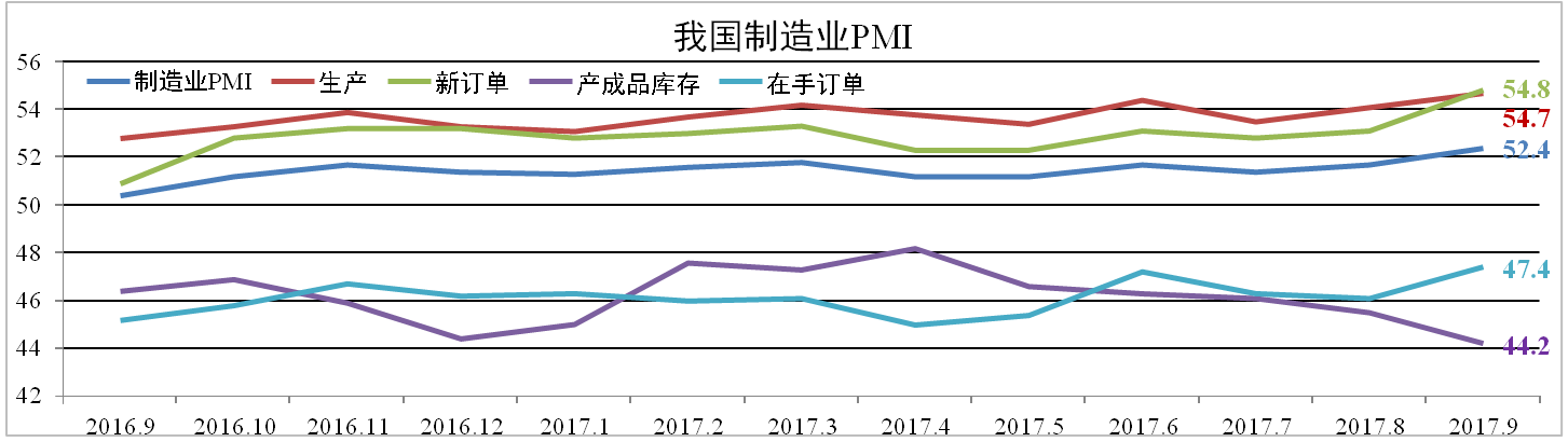 9月份我國(guó)官方制造業(yè)PMI為52.4,創(chuàng)下自2012年5月以來(lái)最高點(diǎn)。分項(xiàng)中, 在手訂單、新訂單分別擴(kuò)大1.3、1.7個(gè)百分點(diǎn)至47.4以及54.8,產(chǎn)成品庫(kù)存縮小 1.3個(gè)百分點(diǎn)至44.2,生產(chǎn)上升0.6個(gè)百分點(diǎn)至54.7。