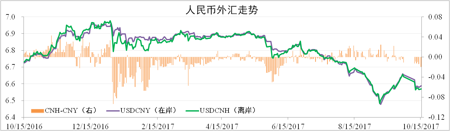 由于美聯(lián)儲(chǔ)縮表以及長(zhǎng)假居民購(gòu)匯需求增加等原因,人民幣貶值。但美 朝局勢(shì)動(dòng)蕩,加之美國(guó)通脹疲軟,美元轉(zhuǎn)弱。截至10月15日,在岸人民幣匯 率為6.5884,環(huán)比貶值0.59%,離岸人民幣為6.5689,環(huán)比貶值0.37%。