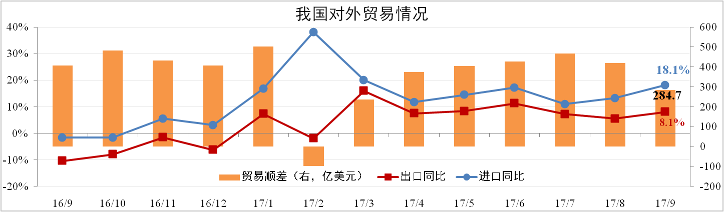 分析認(rèn)為:9月進(jìn)口大幅上升一方面反映國(guó)內(nèi)需求韌性較強(qiáng),下滑不顯著,另一方面環(huán)保造成生產(chǎn)受限,需要更多的進(jìn)口來(lái)彌補(bǔ)國(guó)內(nèi)生產(chǎn)的不足。對(duì)美順差擴(kuò)大或?qū)μ乩势?1月訪華提供談判籌碼,對(duì)出口造成不利影響。