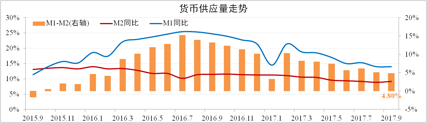 分析認(rèn)為:受上游盈利轉(zhuǎn)好以及產(chǎn)能擴(kuò)張受限影響,企業(yè)部門(mén)融資需求有走弱趨勢(shì)。另外“金九”慘淡收?qǐng)觯慨a(chǎn)調(diào)控趨嚴(yán),旺季不旺。綜合來(lái)看,M2回升動(dòng)能不強(qiáng)。預(yù)計(jì)10月貨幣供應(yīng)依然偏弱。