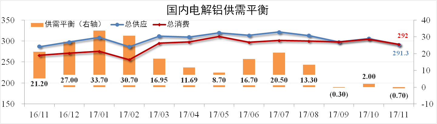據(jù)阿拉丁數(shù)據(jù),11月份我國電解鋁產(chǎn)量291萬噸,同比上漲1.43%,環(huán)比下跌4.8%。凈進(jìn)口0.3萬噸,總供應(yīng)量291.3萬噸,總消費(fèi)量292萬噸,從靜態(tài)數(shù)據(jù)看,當(dāng)月理論供應(yīng)短缺0.7萬噸。