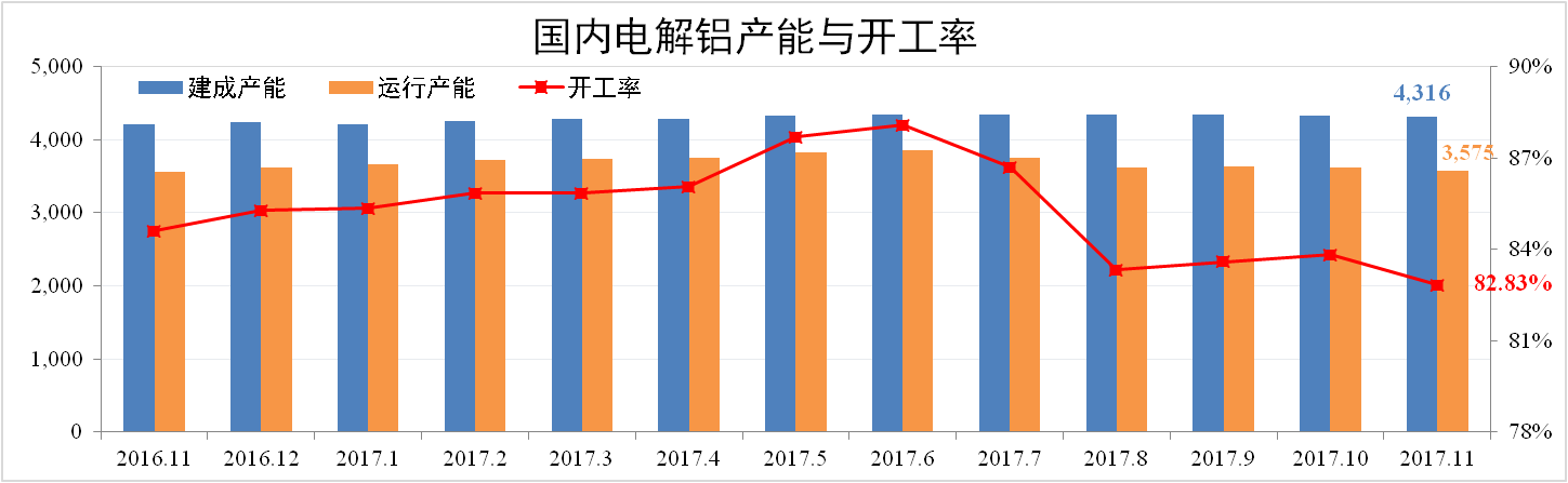 11月份中國電解鋁總產(chǎn)能4,316萬噸,運(yùn)行產(chǎn)能3,575萬噸,開工率82.83%,其中運(yùn)行產(chǎn)能環(huán)比下降1.4%。據(jù)百川資訊統(tǒng)計(jì),截至12月7日,2017年中國電解鋁累計(jì)已減產(chǎn)494.8萬噸,已確定待減產(chǎn)19.7萬噸,年內(nèi)累計(jì)已復(fù)產(chǎn)143.8萬噸。