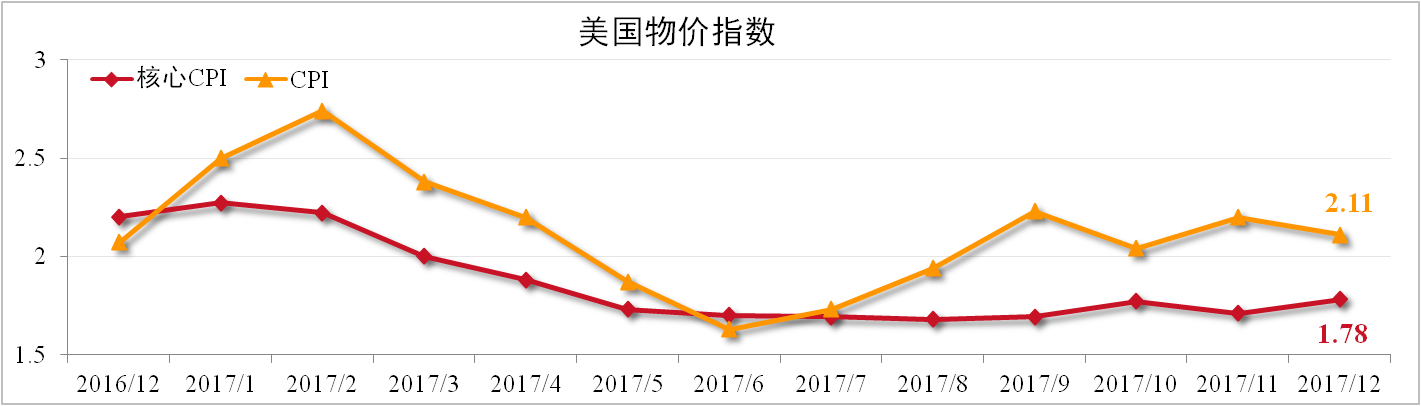 12月美國CPI為2.11%,較上月下滑0.09個百分點。剔除能源和食品的核心CPI為1.78,較上月擴大0.07,超出市場預(yù)期。2017年全年美國零售銷售增長4.2%,為3年最大漲幅。