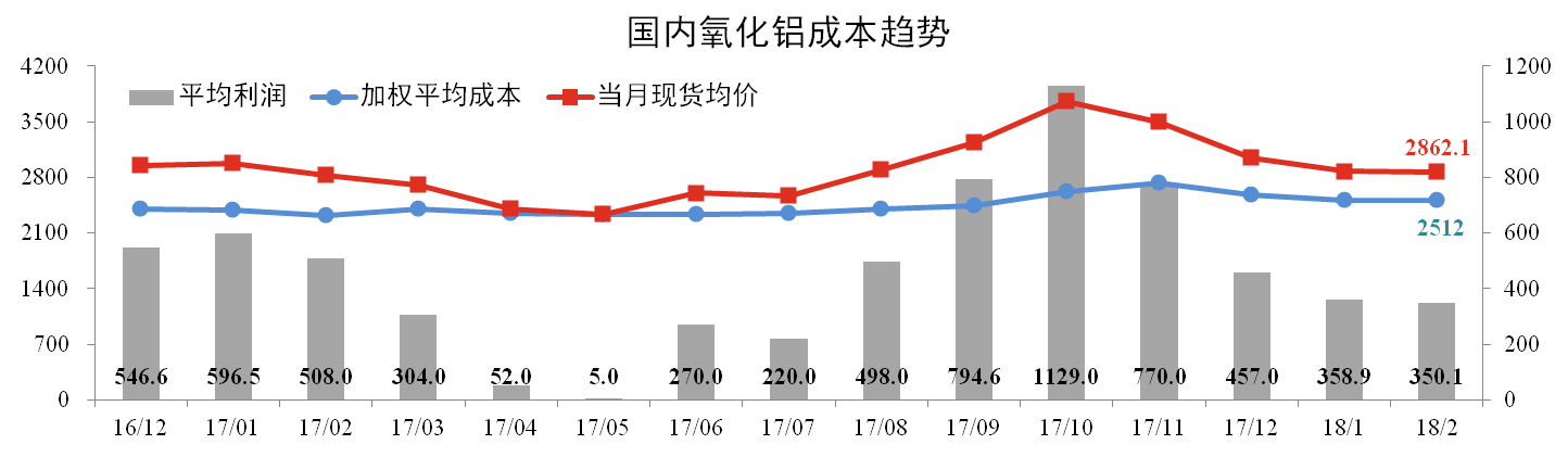 2月份國內(nèi)氧化鋁加權(quán)平均成本為2,512元/噸,環(huán)比下跌0.12個(gè)百分點(diǎn)。當(dāng)月全國氧化鋁現(xiàn)貨成交均價(jià)為2,862.1元/噸,較上月下跌0.41%。理論上,氧化鋁行業(yè)平均利潤水平為350.1元/噸。
