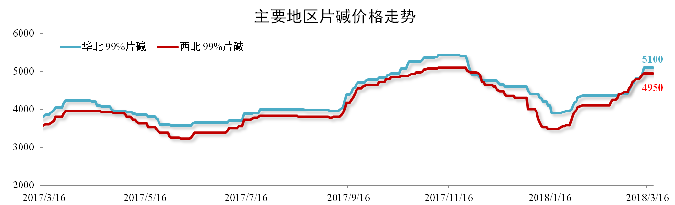 臨近采暖季限產(chǎn)復(fù)工時點,下游企業(yè)備貨需求旺盛,2月下旬至今片堿價格大幅上漲。截止2018年3月19日,華北99%片堿價格報5100元/噸,環(huán)比上漲17.24%,西北99%片堿價格報4950元/噸,環(huán)比上漲20.73%。