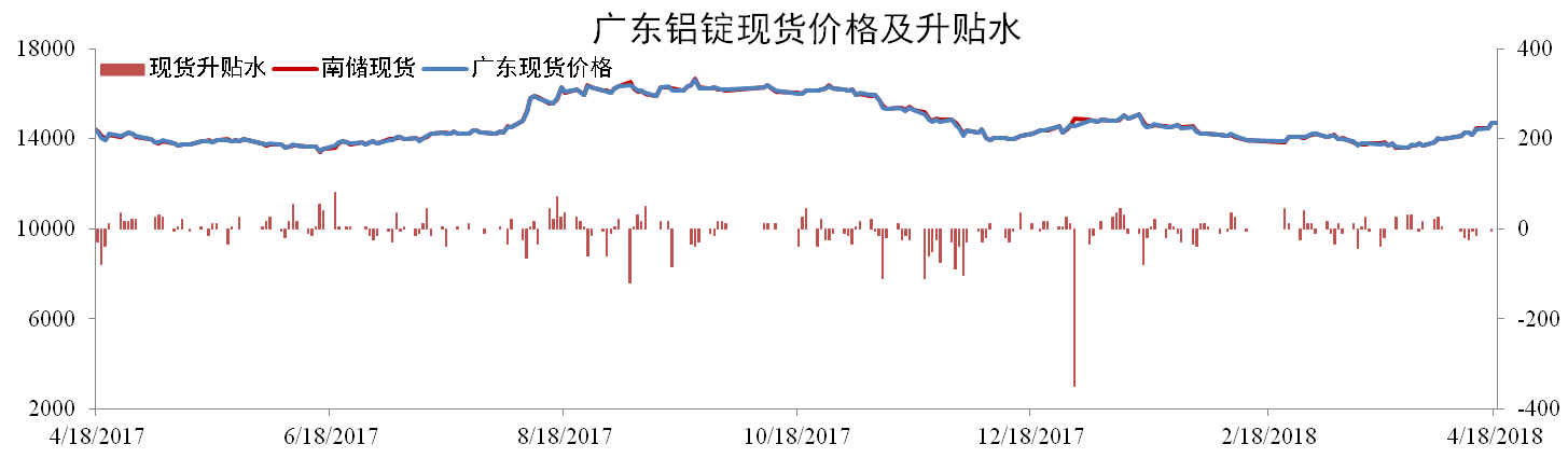 截至4月18日,南儲(chǔ)華南鋁錠現(xiàn)貨價(jià)報(bào)14,720元/噸,環(huán)比上升6.74%,廣東現(xiàn)貨成交價(jià)報(bào)14,720元/噸,環(huán)比上升7.05%。截至2018年4月12日,全國鋁錠庫存為211.74萬噸,環(huán)比上升3.13%。南海庫存為42.11萬噸,環(huán)比上升8.59%。
