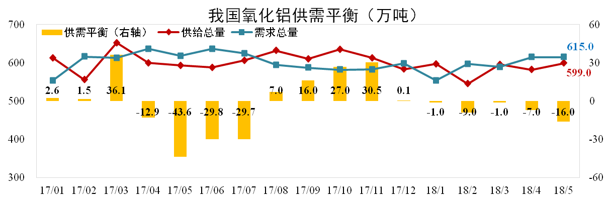 發(fā)稿時間:2018-06-22截至5月底,我國氧化鋁建成產(chǎn)能8167萬噸,運行產(chǎn)能7297萬噸,開工率89.35%,環(huán)比上升1.17個百分點。其中國內氧化鋁產(chǎn)量607萬噸,進口氧化鋁8萬噸,供給總量599萬噸,測算的需求量為615萬噸,理論短缺16萬噸。