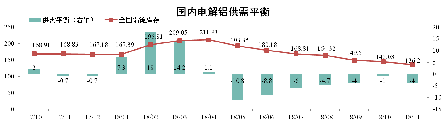 據(jù)阿拉丁數(shù)據(jù),11月原鋁產(chǎn)量301萬(wàn)噸,凈進(jìn)口1萬(wàn)噸,總供應(yīng)量為302萬(wàn)噸,消費(fèi)量為306萬(wàn)噸,當(dāng)月理論供應(yīng)短缺4萬(wàn)噸。11月底全國(guó)鋁錠庫(kù)存136.2萬(wàn)噸,環(huán)比下降6.09%。
