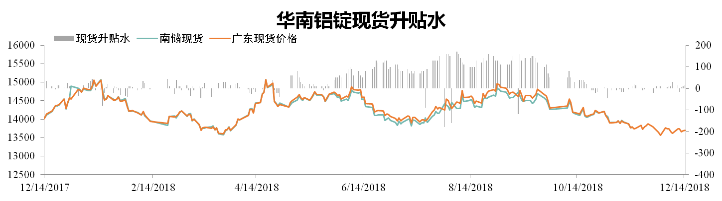 截至12月14日,南儲(chǔ)華南鋁錠現(xiàn)貨價(jià)報(bào)13680元/噸,環(huán)比上漲0.07%,廣東現(xiàn)貨成交價(jià)報(bào)13695元/噸,環(huán)比上漲0.11%。全國(guó)鋁錠庫(kù)存為136.2萬(wàn)噸,環(huán)比下降6.09%。南海庫(kù)存為18.6萬(wàn)噸,環(huán)比下降14.52%。