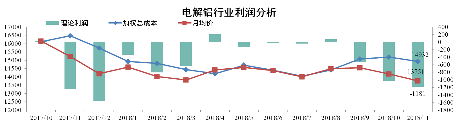 分析認(rèn)為:11月電力及陽(yáng)極成本有所回落,但鋁價(jià)的大幅下跌,導(dǎo)致電解鋁企業(yè)虧損繼續(xù)擴(kuò)大。煤炭?jī)r(jià)格目前表現(xiàn)松動(dòng),電價(jià)承壓下行。目前電解鋁成本已觸利潤(rùn)底線,企業(yè)或減產(chǎn)以應(yīng)對(duì)維持成本平衡。