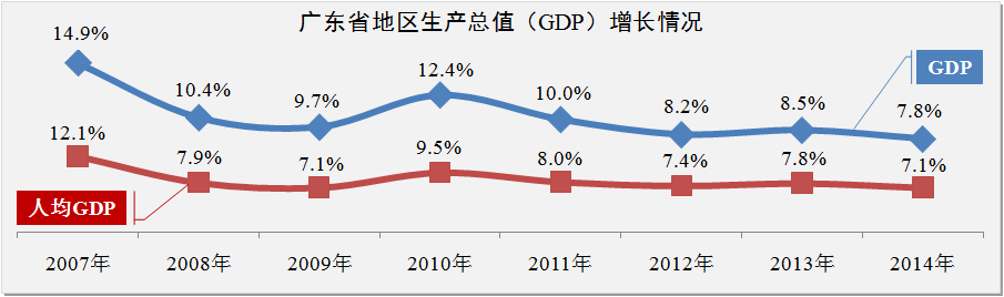 廣東經(jīng)濟方面。2014年廣東實現(xiàn)地區(qū)生產(chǎn)總值6.8萬億,全國占比10.7%,同比增長7.8%,較全國增速多0.4個百分點。其中第一產(chǎn)業(yè)增長3.3%,第二產(chǎn)業(yè)增長7.7%,第三產(chǎn)業(yè)增長8.2%。人均GDP方面,全年人均GDP同比增長7.1%,絕對收入首次超過1萬美元。總體而言,2014年全省經(jīng)濟運行雖有所回落,但運行基調(diào)基本平穩(wěn)。
