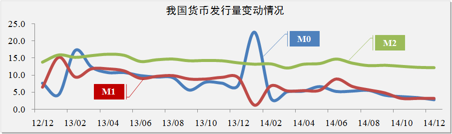 貨幣市場方面。2014年度我國M1的回落速度明顯高于M2的回落速度,表明銀行的定期存款增加,市場交易活力下降。綜合分析近年來我國貨幣發(fā)行量,2014年度貨幣發(fā)行量同比減少35%,但由于我國基礎(chǔ)貨幣流向存在不均衡特點,穩(wěn)健的貨幣政策在抑制投資過熱的同時,也加劇了部分行業(yè)市場出現(xiàn)通貨緊縮的風險。研究認為,2015年央行將在穩(wěn)健的基礎(chǔ)上進一步強化定向?qū)捤韶泿耪撸⒃阢y行業(yè)以及制造業(yè)方面會有所寬松舉措。