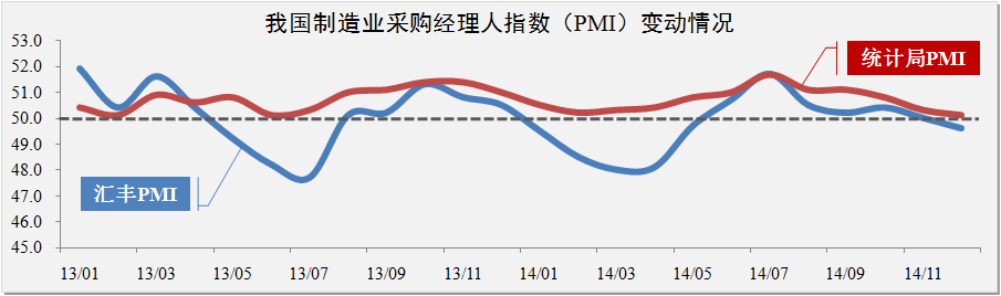 制造業(yè)方面。2014年末我國制造業(yè)采購經(jīng)理指數(shù)(PMI)下跌至50.1%,逼近50%的臨界點。匯豐PMI跌至49.6%,較統(tǒng)計局發(fā)布PMI低0.5個百分點,我國中小企業(yè)的發(fā)展速度明顯放緩。12月份PMI數(shù)據(jù)回落至臨界點具有季節(jié)性因素影響,但從全年變動趨勢上看,PMI及匯豐PMI的持續(xù)下滑說明我國制造業(yè)發(fā)展所面臨的壓力正不斷地擴大和增強。