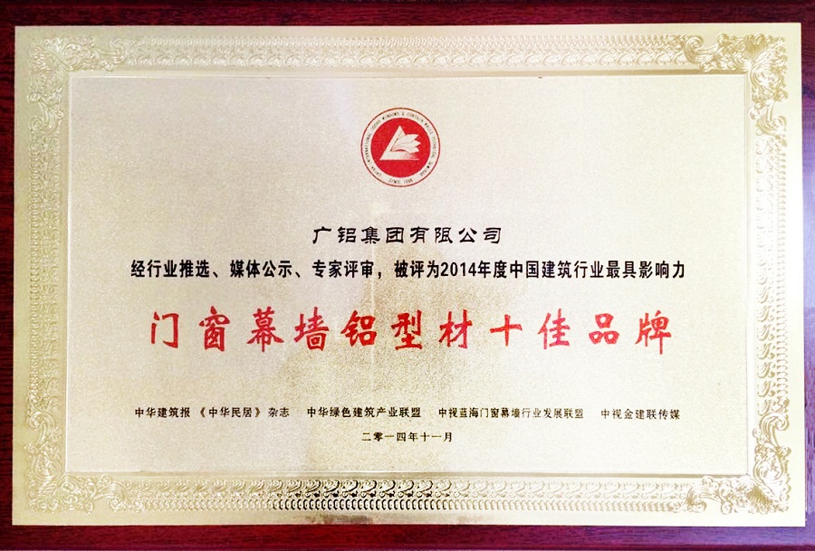 歷時(shí)三個(gè)多月,2014年度中國(guó)建筑行業(yè)最具影響力“門(mén)窗幕墻鋁型材十佳品牌”評(píng)選名單終于在11月份火熱出爐。廣鋁集團(tuán)憑借雄厚的綜合實(shí)力和市場(chǎng)影響力獲此殊榮。