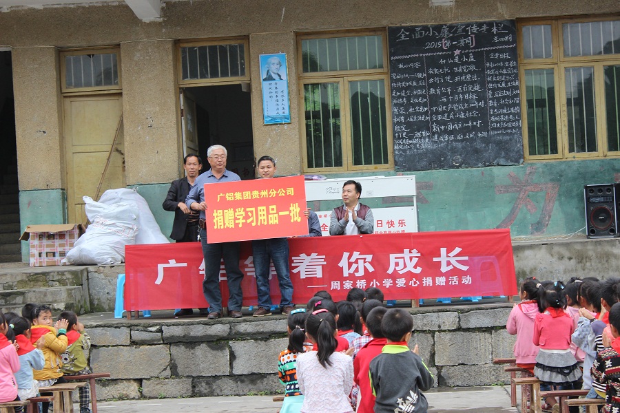 2015年5月27日,在六•一國際兒童節(jié)來臨之際,為豐富孩子們的精神生活,讓留守兒童度過一個多姿多彩的節(jié)日,在清鎮(zhèn)市工會領(lǐng)導的帶領(lǐng)下,貴州廣鋁鋁業(yè)有限公司工會組織公司人資處、財務(wù)處、安環(huán)處等相關(guān)處室人員前往犁倭鎮(zhèn)周家橋小學開展愛心捐贈活動。