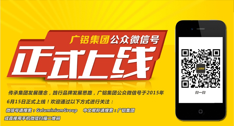 廣鋁集團公眾微信號已認證開通并上線運行,歡迎廣大朋友及客戶關(guān)注廣鋁集團微信公眾號。我們有理由期待,廣鋁集團公眾微信號將會帶給廣大朋友及客戶更加值得期待的服務。