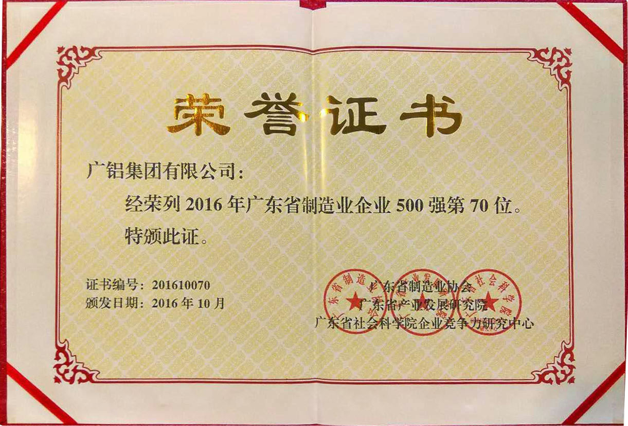 廣鋁集團榮列2016年廣東省制造業(yè)500強企業(yè)第70名