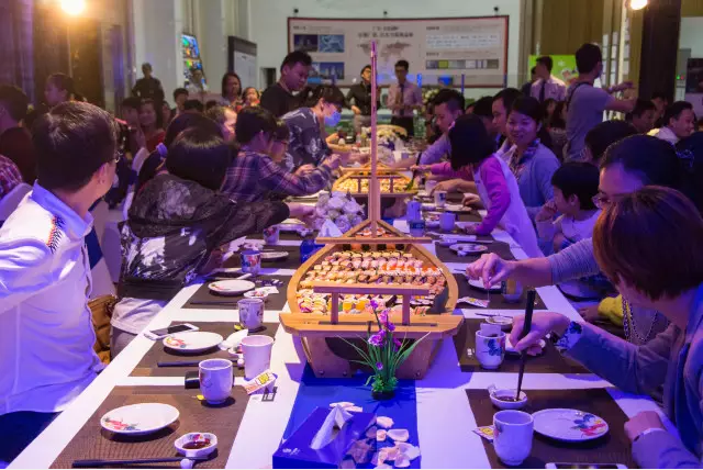 欣賞完園林美景,業(yè)主們移步回銷售中心進(jìn)行晚宴,映入眼簾的是一條條全鮮壽司船擺滿餐桌。船身足足兩米多長(zhǎng),船上擺滿了各種各樣的壽司和各種生魚片刺身,業(yè)主們紛紛表示被這場(chǎng)面震驚了,看著這豐盛的壽司宴,都被吸引得垂涎三尺,食指大動(dòng)了??谏啾M興之余,在座的業(yè)主賓客都不忘與身旁素不相識(shí)的鄰居暢談起來,他們當(dāng)中有醫(yī)生,有企業(yè)高管,雖在不同行業(yè),但對(duì)廣鋁·荔富湖畔的共同認(rèn)可,讓他們有聊不完的話題。