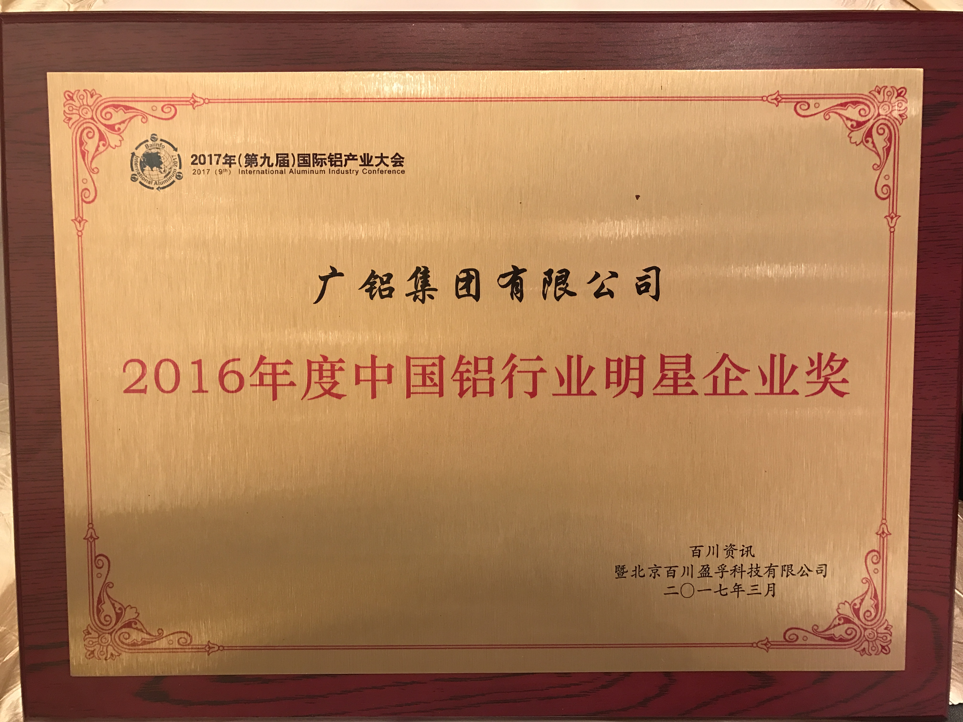 廣鋁集團有限公司榮獲 2016 年度中國鋁行業(yè)明星企業(yè)獎