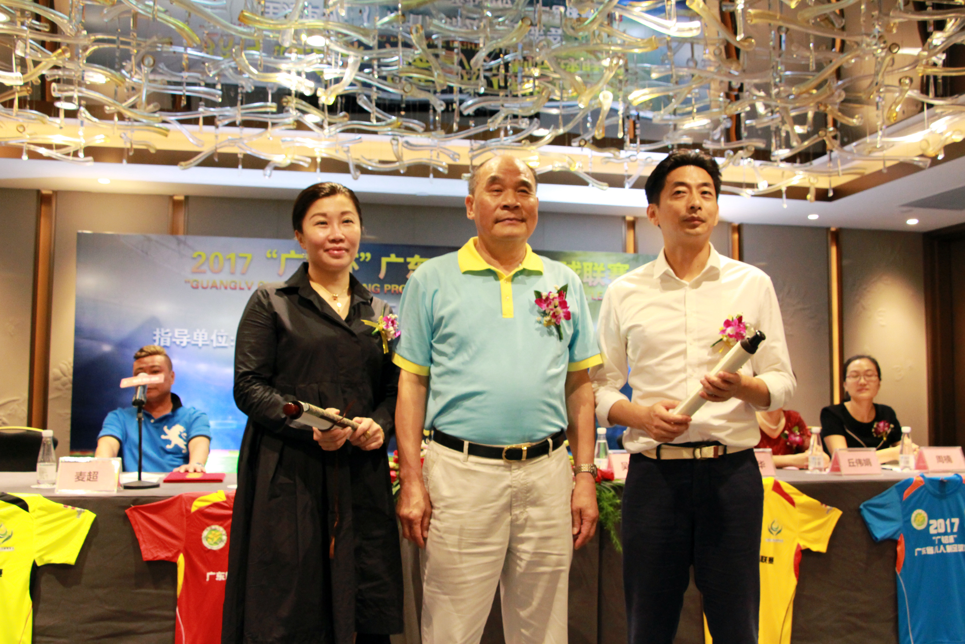 廣鋁公益基金會理事長吳作榮先生與廣東省足球協會副秘書長席兵先生、聲色體育董事總經理曾巧瑩女士交換禮品