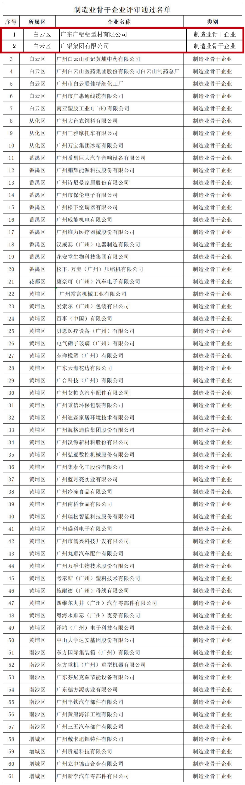 發(fā)稿時間:2019-03-01日前,廣州市工業(yè)和信息化委員會公布了“三個一批”企業(yè)入庫名單(第二批):制造業(yè)骨干企業(yè)61家、兩高四新企業(yè)375家、小升規(guī)培育企業(yè)712家。廣鋁集團入選為“制造業(yè)骨干企業(yè)”,廣東廣鋁鋁型材有限公司分別入選為“制造業(yè)骨干企業(yè)”、“兩高四新企業(yè)”。