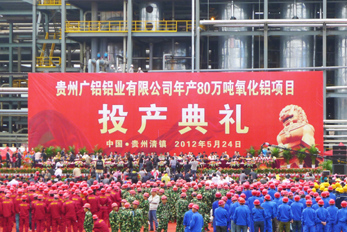 2012年5月24日,貴州廣鋁鋁業(yè)有限公司年產(chǎn)80萬(wàn)噸氧化鋁項(xiàng)目投產(chǎn)典禮在貴州省清鎮(zhèn)市隆重舉行。貴州省人民政府副省長(zhǎng)慕德貴,廣東省人民政府副省長(zhǎng)劉志庚,全國(guó)人大財(cái)經(jīng)委委員、空軍原副政委、中將芮清凱,全國(guó)政協(xié)特邀委員、武警部隊(duì)原副政委、中將劉世民,貴州省人大原常務(wù)副主任肖永安,廣州市人大主任張桂芳,廣州市政協(xié)原主席林元和,貴陽(yáng)市委副書記、市長(zhǎng)李再勇,廣州市人大副主任趙小穗,貴陽(yáng)市人大主任李忠,廣州市副市長(zhǎng)曹鑒燎,廣州市政協(xié)副主席平欣光,貴陽(yáng)市政協(xié)副主席張承新,貴陽(yáng)市人大常委會(huì)副主任、清鎮(zhèn)市委書記楊明晉等粵黔兩地政府部門眾多領(lǐng)導(dǎo)悉數(shù)出席,同時(shí)百余家關(guān)聯(lián)企業(yè)前往考察。此次投產(chǎn)典禮現(xiàn)場(chǎng)出席人員近2000人,場(chǎng)面空前盛大。