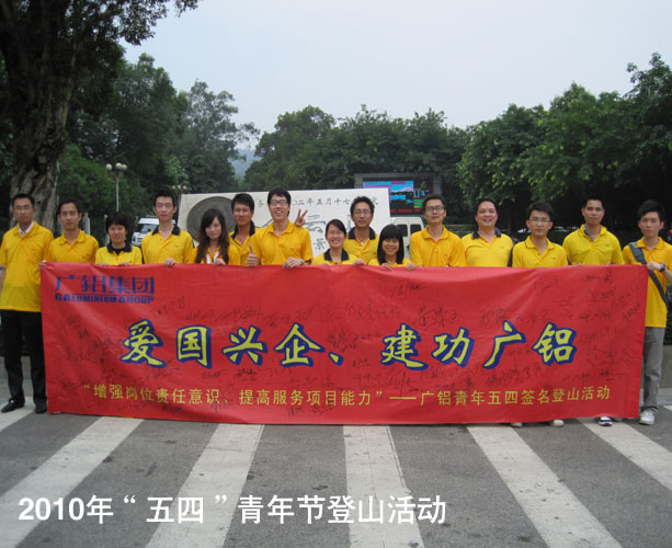 4月30日,集團(tuán)公司40余名青年團(tuán)員積極參加了廣鋁集團(tuán)“愛國興企、建功廣鋁”簽名活動(dòng),活動(dòng)在公司行政辦公樓1樓會(huì)議廳敲響鑼聲。隨后,廣大青年團(tuán)員向廣州著名的景點(diǎn)——白云山奮勇進(jìn)發(fā),展現(xiàn)勇者的風(fēng)采與青春的飛揚(yáng)。4月的白云山春意盎然,鳥語花香,鮮紅的廣鋁橫幅在蔥綠的白云山上顯得格外耀眼,在兩個(gè)多小時(shí)的登山過程中,我們欣賞著沿途的美麗景色,歡聲笑語中已至最高峰。