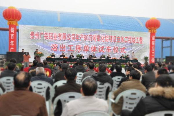 隨后,廣鋁集團(tuán)葉董事長(zhǎng)代表集團(tuán)的全體干部員工,向前來(lái)參加儀式的各位領(lǐng)導(dǎo)、來(lái)賓、表示最熱烈的歡迎和衷心的感謝,并詳細(xì)介紹本項(xiàng)目建設(shè)的基本情況。貴陽(yáng)市委副書記、市長(zhǎng)李再勇及清鎮(zhèn)市委書記楊明晉同志也相繼致詞,為本項(xiàng)目單體試車表示衷心的祝賀,并對(duì)本項(xiàng)目自開(kāi)工以來(lái)貴州廣鋁及設(shè)計(jì)單位、監(jiān)理單位和全體施工單位不怕困難、艱苦奮斗、迎難而上的精神,“小雨不停,大雨搭棚,風(fēng)雨無(wú)阻,日夜兼程”的建設(shè)本項(xiàng)目,確保溶出工序如期單體試車給予了充分的肯定,同時(shí)還表示本次試車標(biāo)志著項(xiàng)目即將勝利建成投產(chǎn),對(duì)“促穩(wěn)定、保增長(zhǎng)”,拉動(dòng)清鎮(zhèn)地區(qū)、貴陽(yáng)市和貴州省的經(jīng)濟(jì)和社會(huì)發(fā)展具有重要而深遠(yuǎn)的意義。最后,省委常委貴陽(yáng)市委書記李軍宣布工程竣工、單體試車開(kāi)始,并按下了溶出系統(tǒng)的啟動(dòng)器,經(jīng)過(guò)溶出系統(tǒng)操作工人的謹(jǐn)慎操作后,李軍書記宣布本次試車圓滿成功!